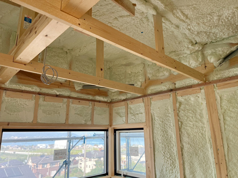 吹付断熱の施工が完了しました。(内断熱)著しい隙間がないか目視確認しました。